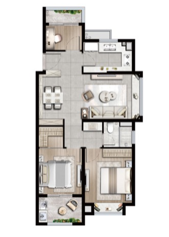 该户型在紧凑中凸显实用与舒适。合理分布的卧室保证家庭成员的空间独立性。主卫和公卫功能齐备,满足不同使用需求。客厅开放空间与餐厅相连,延展居住视野,营造温馨家居体验。户型突出通风与采光设计,实现居住环境的优良舒适。此类户型适合注重生活品质且需求功能灵活的年轻家庭。
