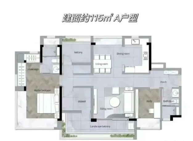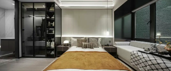 约115㎡四房:作为主力户型,此面积段实现四房功能本身即是一种效率体现。其中,“和颐”户型采用端厅设计,配合超长飘窗,在视觉和功能上拓展了客厅边界。独立且尺度适宜的步入式衣帽间设计,提升了主卧套间的品质感。该户型提供了不同的景观朝向选择,直面花地河或俯瞰城景,适配不同偏好。