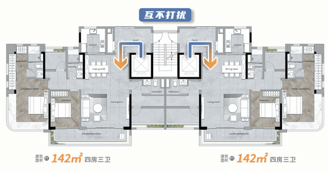 约142㎡四房:此户型代表了项目对高端改善需求的解答。通过“独梯独户”的配置,确保了入户的专属性与私密性,电梯厅形成额外的过渡空间。约19平方米的宽阔阳台、双主套设计(其一配备270度弧形飘窗),在功能完备的基础上,强化了空间的尺度感与景观享受,其体验感向更高级别的居住产品靠拢。
