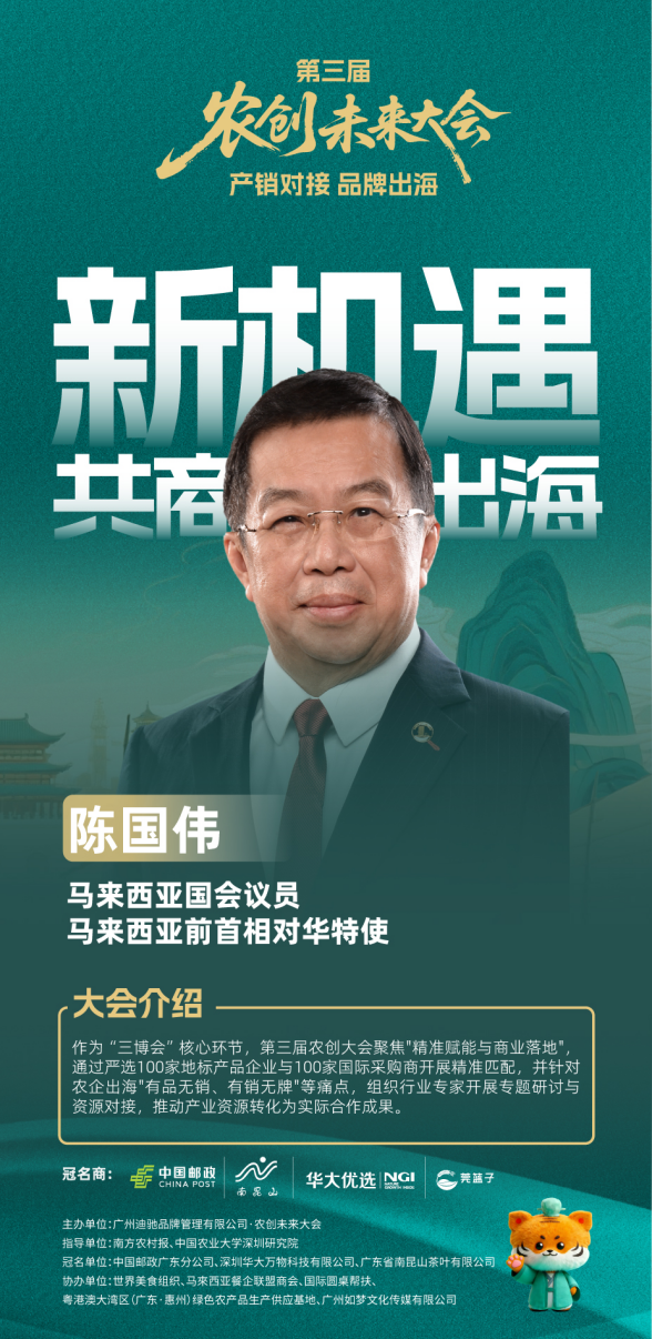 本次大会最受瞩目的环节,当属4月10日下午1:30至5:30举行的“农创未来大会峰会”。峰会特别邀请马来西亚国会议员、前对华特使陈国伟亲临现场致辞,马来西亚采购团将作为主宾国深度参与,携100余家海内外采购团现场开展采购对接,为中国农业企业打通通往东南亚市场的“直通车”。